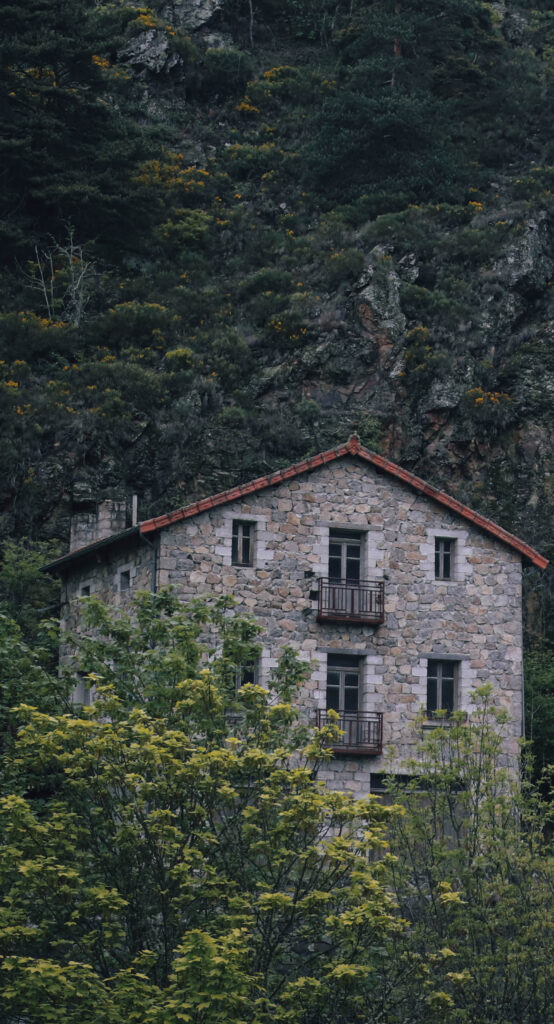 Au creux d’une forêt mystérieuse, cette maison semble avoir été abandonnée par le temps lui-même, perchée à flanc de montagne comme un secret bien gardé. Ses murs de pierre portent les traces d’histoires anciennes, peut-être celles de voyageurs égarés ou de rêveurs solitaires. Les arbres et les buissons l’entourent avec tendresse, comme pour la cacher du monde extérieur.